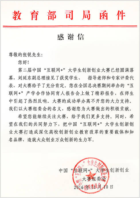 2018年,乐球直播在线连续多年为中国国际互联网+大学生创新创业大赛做出积极贡献,获教育部来函致谢。